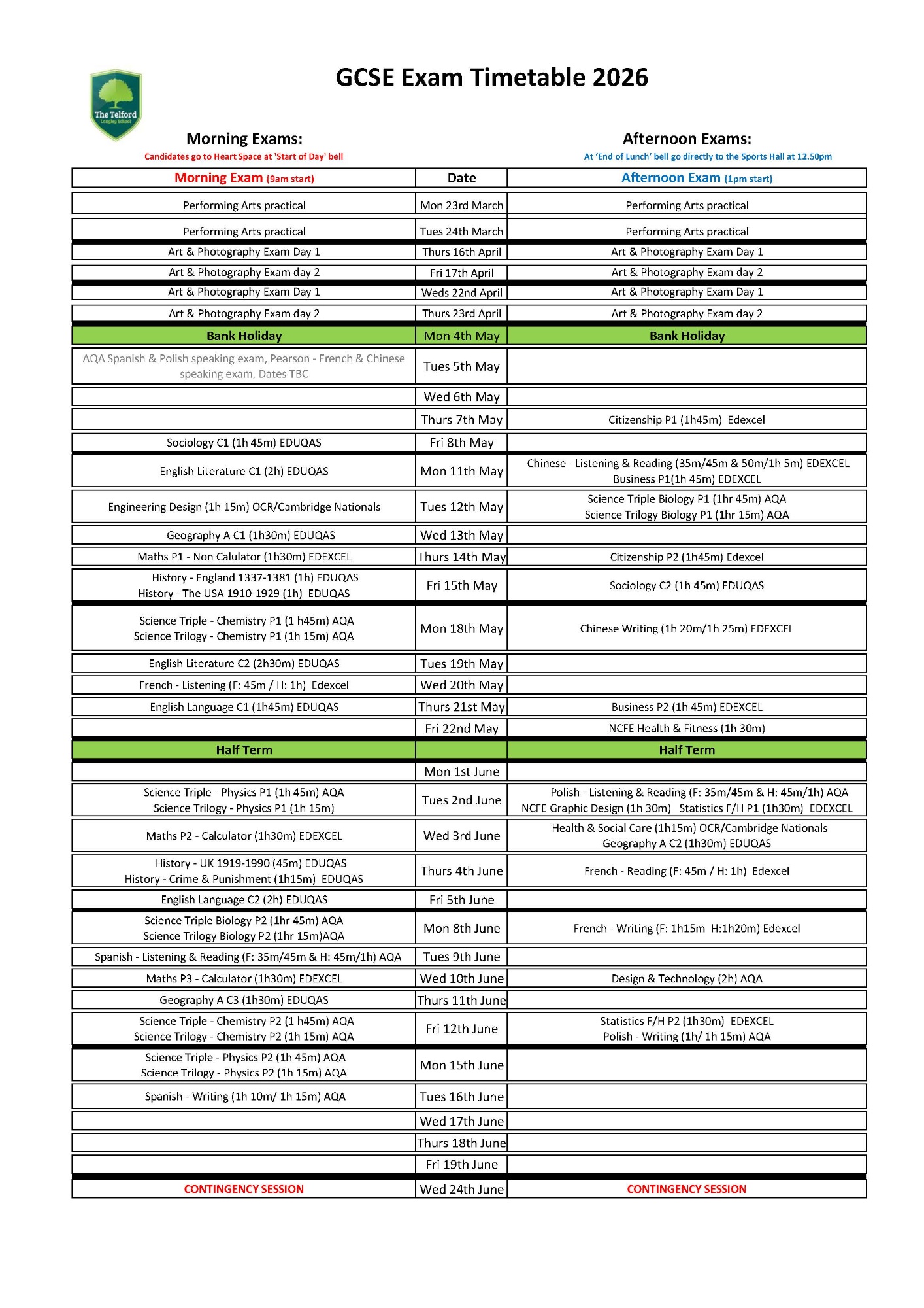 The Exam Timetable for the summer exams has now been released and can be found below. You can click on the link below to download a copy.SUMMER 2026 - Year 11 Exam Timetable - Download