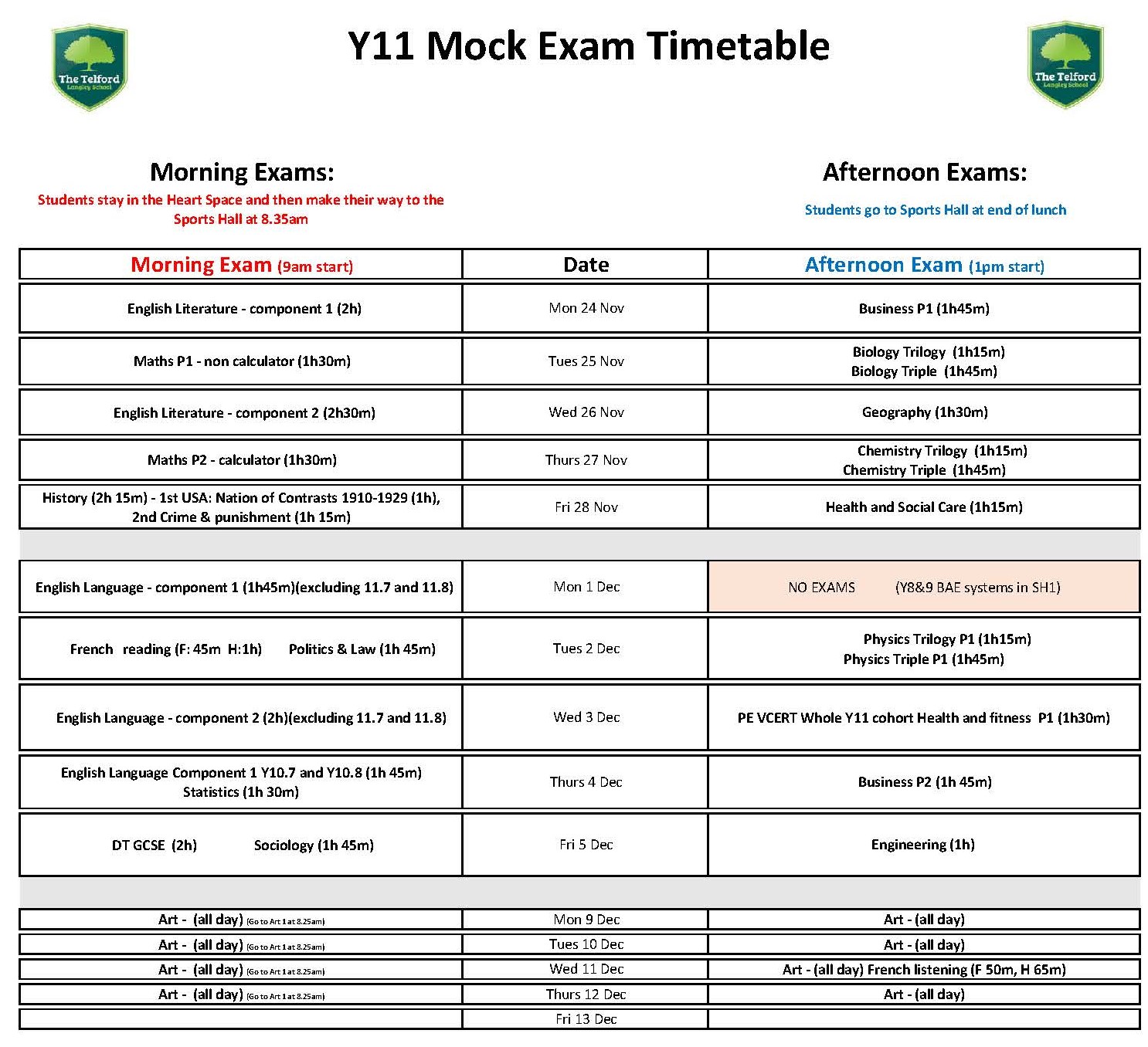 Year 11 Autumn mocks Exams 2025 timetable