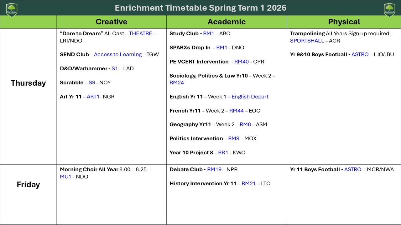 Not only can enrichment help students develop and further their skills, but the benefits for our school are substantial. Enrichment is designed to provide opportunities for our children and young people to build their knowledge, skills, understanding and personal development through leisure and enrichment activities.