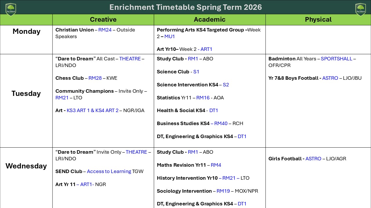 Sessions run from 3.00pm until 4.00pm and are open to all students to attend. Registers are taken daily, and parents and carers are notified should any activity be cancelled.